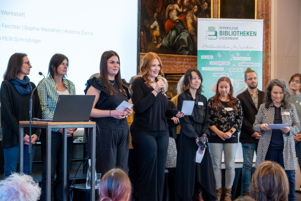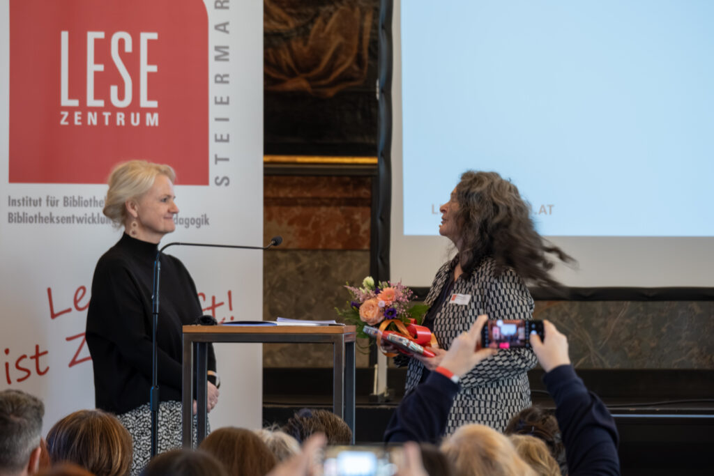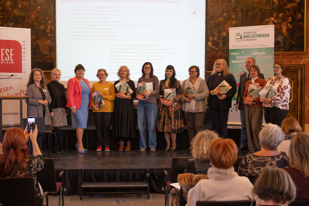 Ein weiterer wichtiger Programmpunkt unserer Herbsttagung stellte die Ehrung der Absolvent*innen der bibliothekarischen Ausbildungskurse des vergangenen Jahres durch Landeshauptmann-Stellvertreterin Manuela Khom dar. Zudem wurden im Vorfeld der Lesung Vea Kaisers unter allen Tagungsteilnehmer*innen Buchpreise verlost.