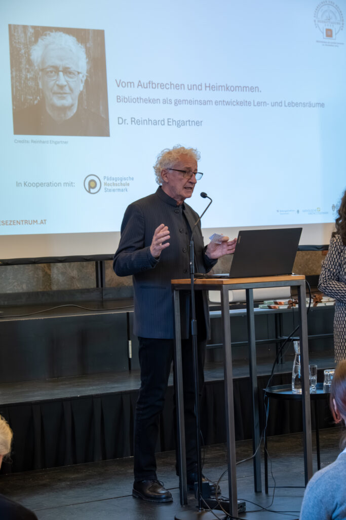 Dr. Reinhard Ehgartner, langjähriger Geschäftsführer des Österreichischen Bibliothekswerks und Leiter der Bücherei Michaelbeuern hat mit seinem Hauptvortrag zum Thema „Aufbrechen und Heimkommen“ alle in seinen Bann gezogen. Der Hauptvortrag wurde als sehr inspirierend wahrgenommen und mit großem Interesse verfolgt. Hier eine Auswahl der Folien zum Hauptvortrag von Dr. Reinhard Ehgartner.