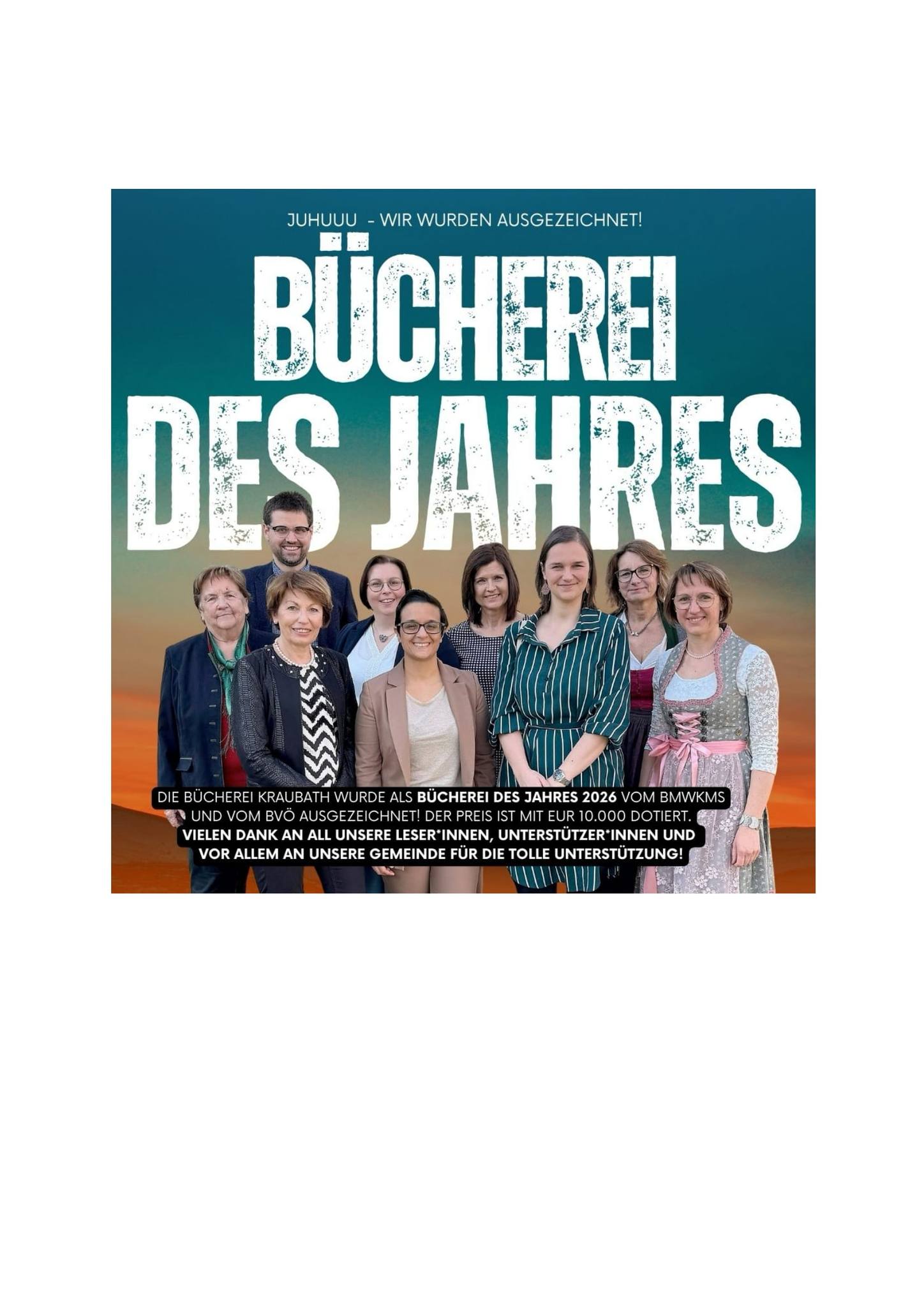 Wir freuen uns sehr, dass unter den fünf ausgezeichneten Büchereien auch die steirische Bücherei Kraubath an der Mur ist. Herzlichen Glückwunsch an das gesamte Team der Bücherei Kraubath zu dieser außerordentlichen Leistung.