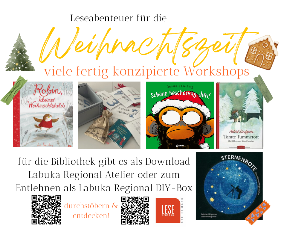 Bereits in diesen schönen Herbsttagen denken wir an Leseabenteuer für die Weihnachtszeit in den Bibliotheken. Viele fertig konzipierte Workshops stehen als Labuka Regional Atelier zum Download auf der Website oder zum Entlehnen als Labuka Regional DIY-Box kostenlos zur Verfügung.