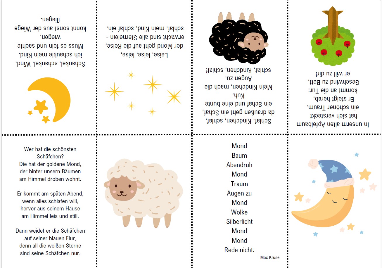 Dieses Minibuch zum Selberbasteln mit Reimen und Schlafliedern ist besonders geeignet für Buchstart Steiermark-Veranstaltungen und Teil der DIY-Box „Eine Gute Nacht-Geschichte aus dem Erzählkarton mit dem kleinen Siebenschläfer“.