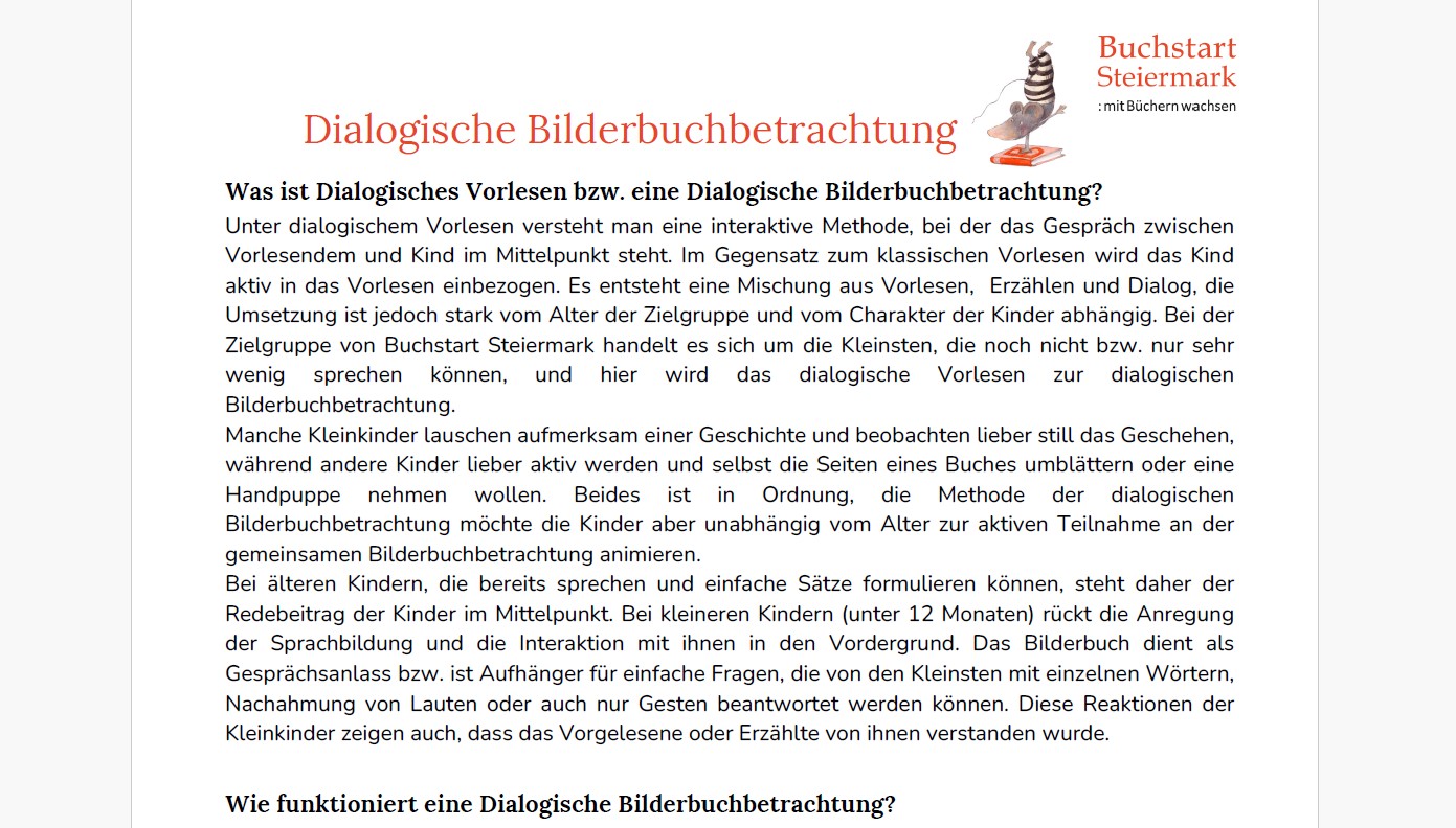 Was ist die dialogische Bilderbuchbetrachtung und wie funktioniert sie? Hier finden Sie einige Umsetzungsinfos für Ihre Buchstart Steiermark-Veranstaltung.