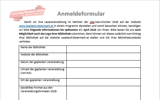 Nur wenn Ihre geplante Veranstaltung für die Lies-was-Wochen 2026 inkl. Veranstaltungsformat und Datum bis zum 17. April 2026 beim Lesezentrum anhand des Anmeldeformulars angemeldet und das Logo der Bibliothek übermittelt wurde, kann diese als besondere Fördervoraussetzung im Zuge der Landesförderung berücksichtigt werden.